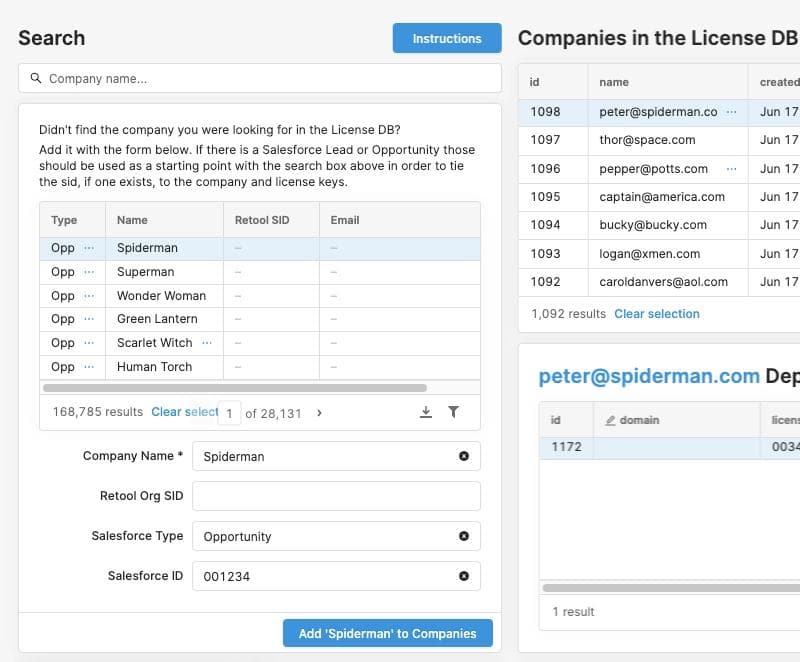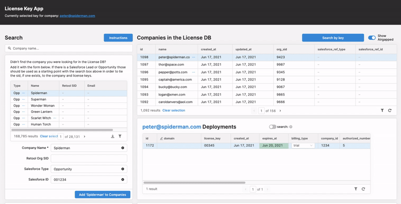 We also wanted to ensure this dashboard and Salesforce (our source of truth for account info) were able to read and write data to each other. One critical detail was ensuring there was a 1:1 mapping between the license keys in our database with Salesforce accounts.