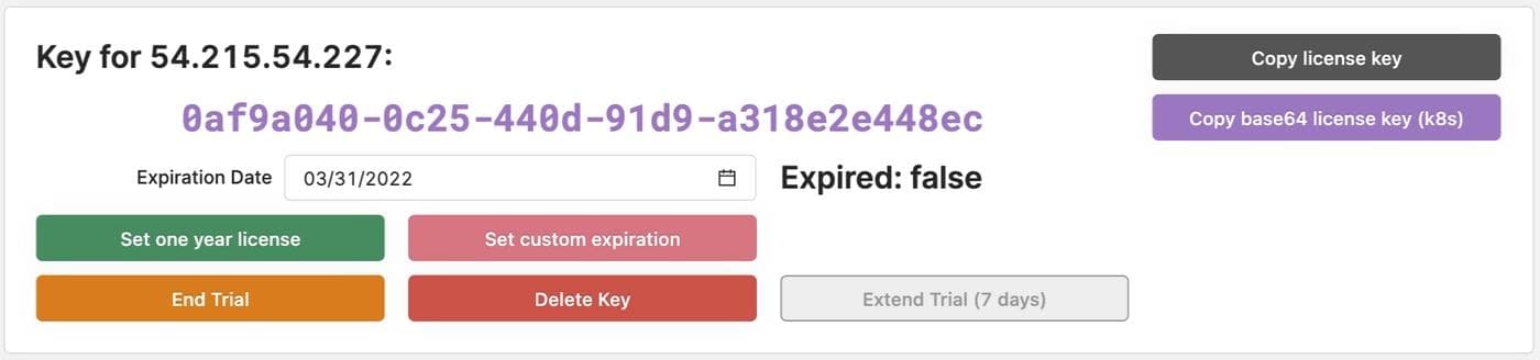 We also provide functionality to copy the key to the clipboard, as well as copy the key as base64. When deploying via Kubernetes, license keys needed to be base64 encoded. We were seeing a lot of errors with people encoding these keys with whitespace, so we added a button that base64 encodes the key correctly and copies it to the clipboard.