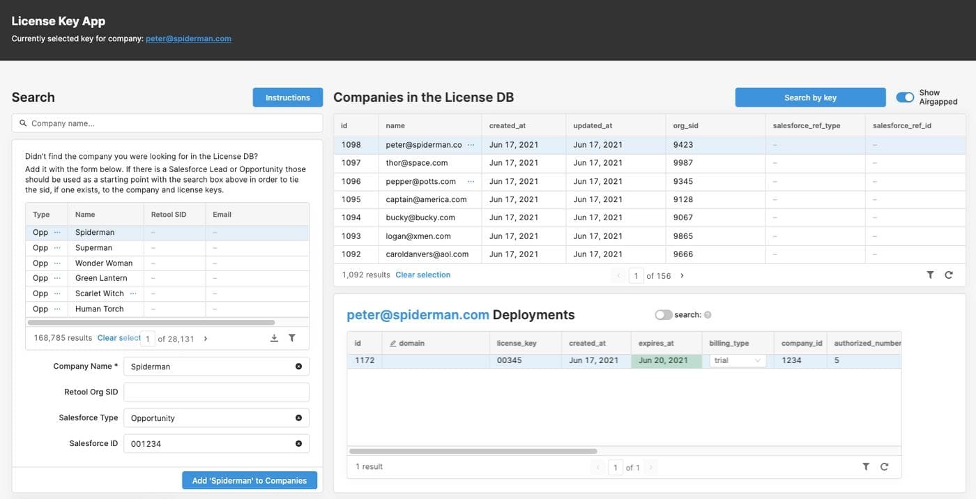 To help developers build business apps safely, we offer a variety of self-hosted Retool plans. But selling self-hosted software means our team needs a way to create, issue, manage, renew, and deactivate license keys for every customer.