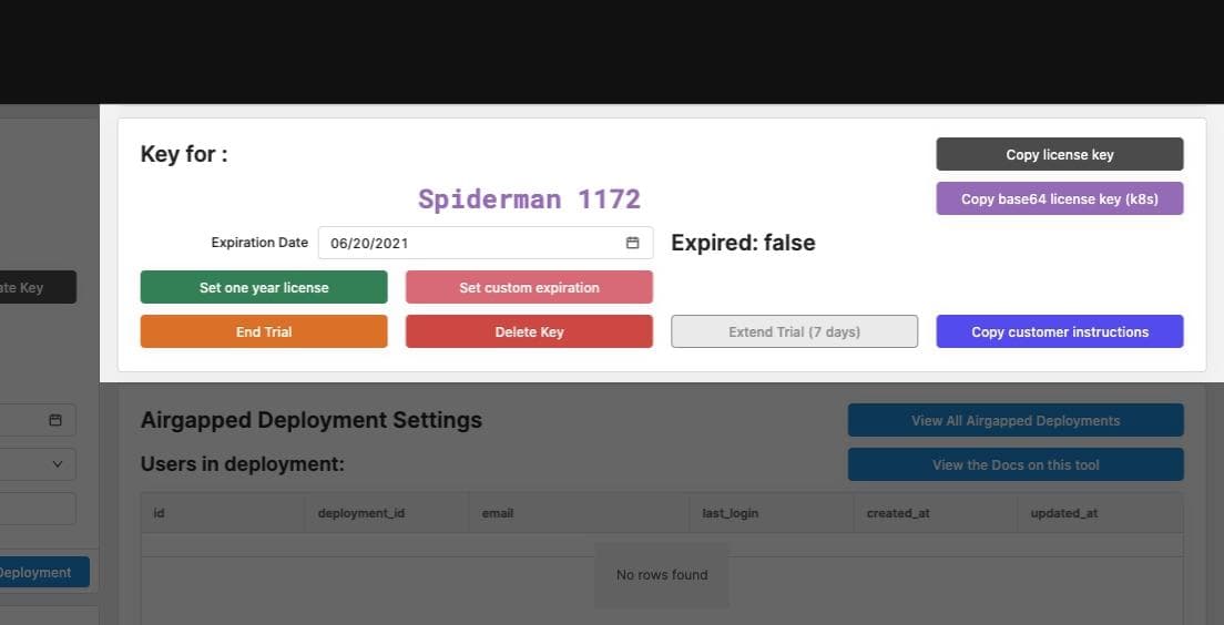 Once a license key has been created, the app offers a few quick actions: setting a custom expiration date, deleting the key, and adding a week to the expiration date of the key. These buttons all trigger Postgres queries which update the deployment based on the selected row of the table displaying these keys.