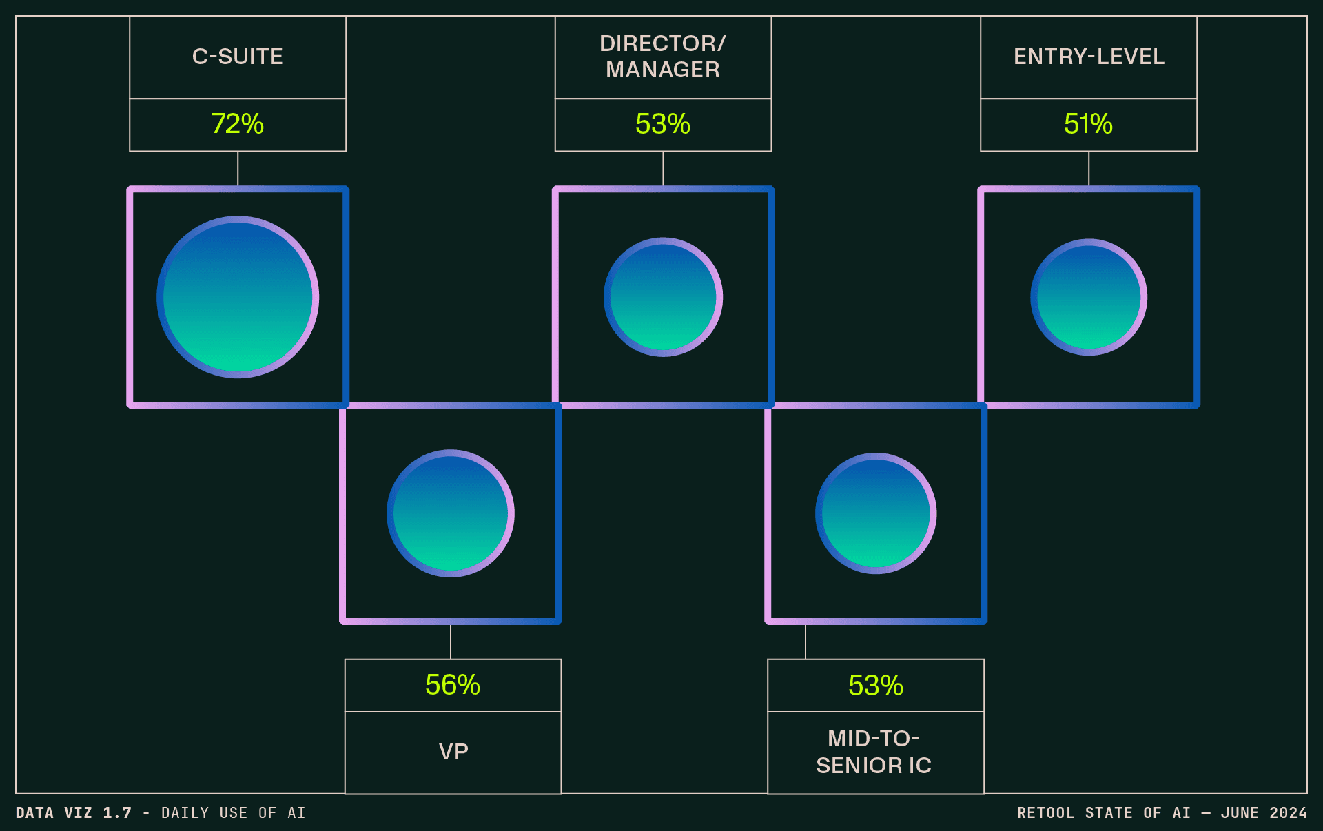 By role, Product and Engineering are leading daily(ish) adoption at 68% and 62.6% respectively, while Design trails at 39%. (Our AI-bullish IT friends are right in the middle of the pack, at 50.1%.)