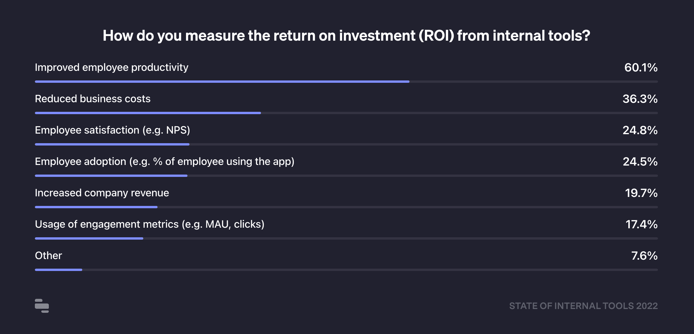 Survey respondents indicated that improved employee productivity (60%, up from 54% in 2021) is their North Star metric for tracking ROI from internal tools. Productivity, which is admittedly nebulous to measure in and of itself, was followed by the more quantitative responses of reduced business costs (36%), and employee satisfaction (25%).