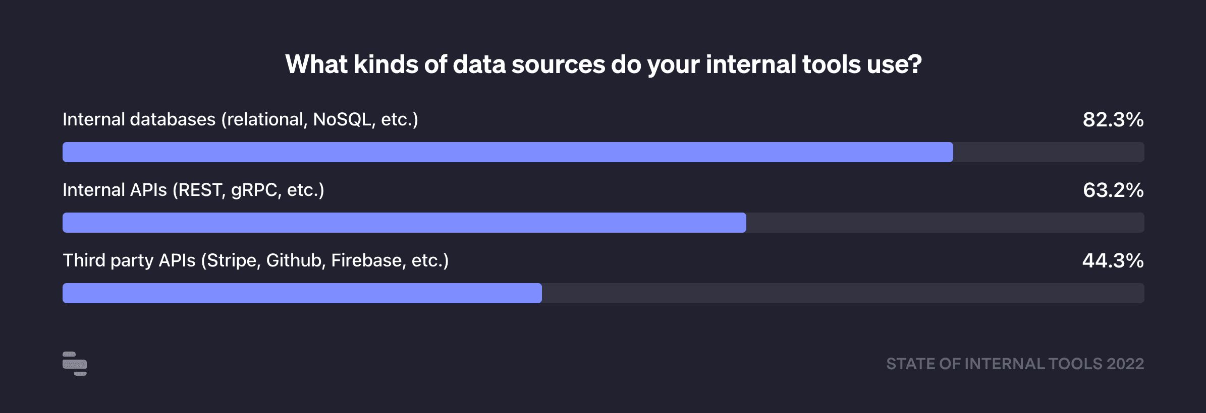 82% of respondents build their internal tools directly on top of databases (production or otherwise), 63% report using internal APIs (REST, gRPC, etc.), and 44% use third party APIs like Stripe, GitHub, etc.