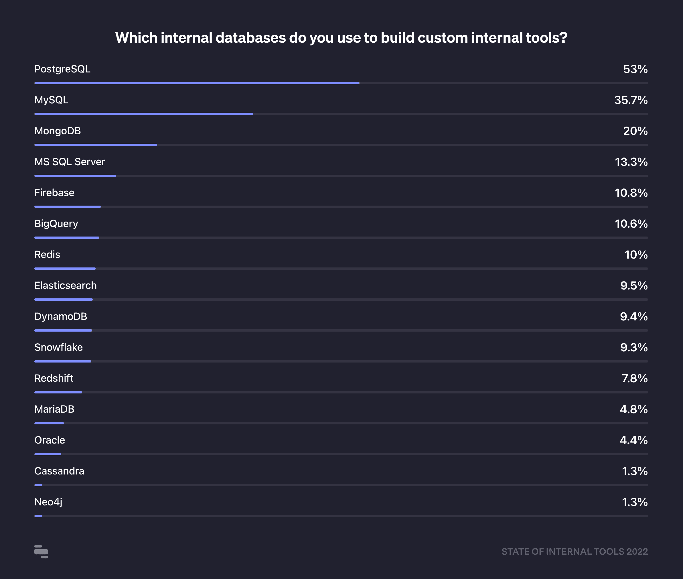 PostgreSQL is far and away the most popular database for internal tools (and perhaps by extension, as a production database among respondents). More than half of respondents who are building on an internal database are using Postgres, followed by 35% using MySQL, and 20% using MongoDB. The top five databases here are all production datastores (Postgres, MySQL, MongoDB, MSSQL, Firebase), but warehouses are also popular (e.g, BigQuery with 10%).