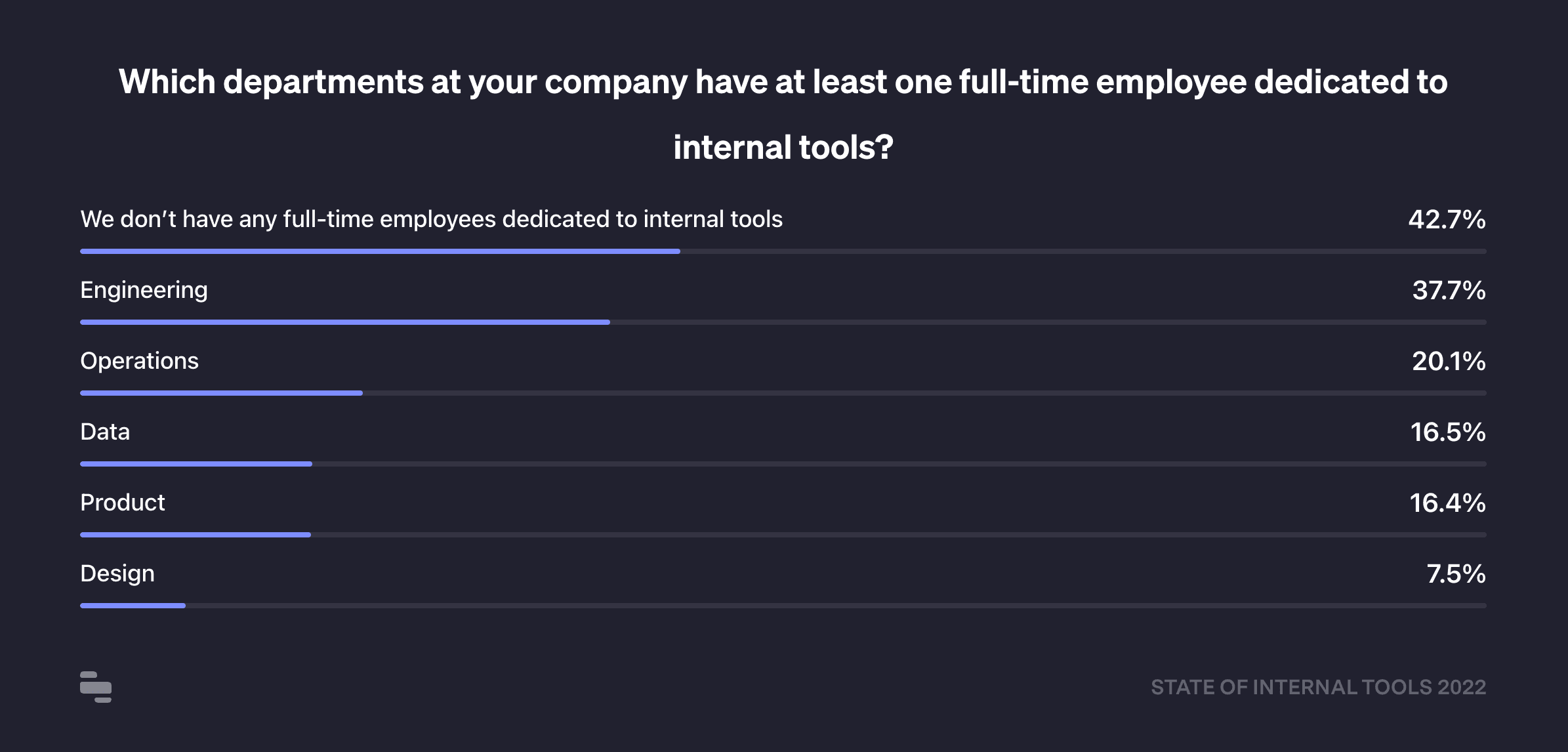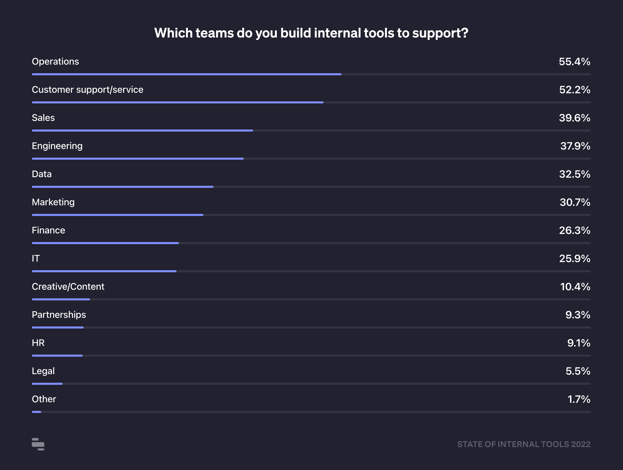 We asked developers which teams they're building internal tools for, and for the first year since we've run this survey (2020), operations teams were the most popular (55%) response, a huge increase from