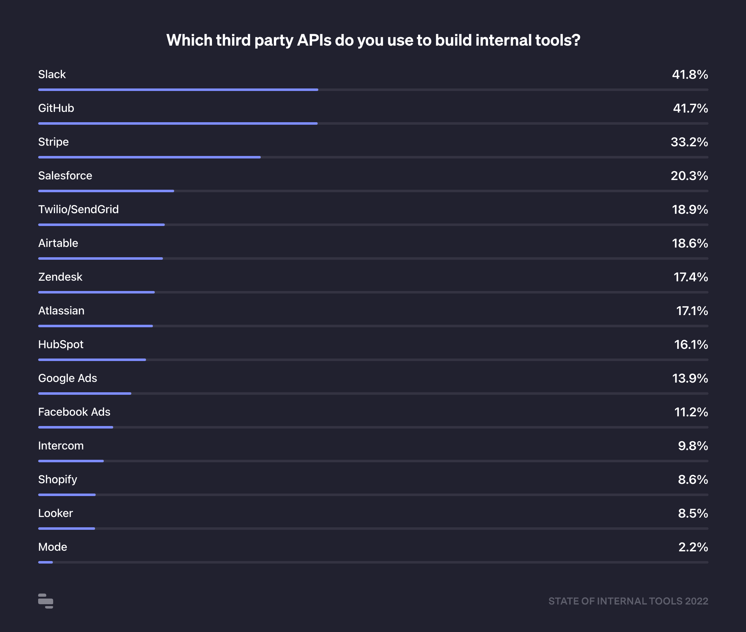 Among third party APIs, Slack, and GitHub are the most popular with 42% of respondents using them, followed by Stripe (33%) and Salesforce (20%).