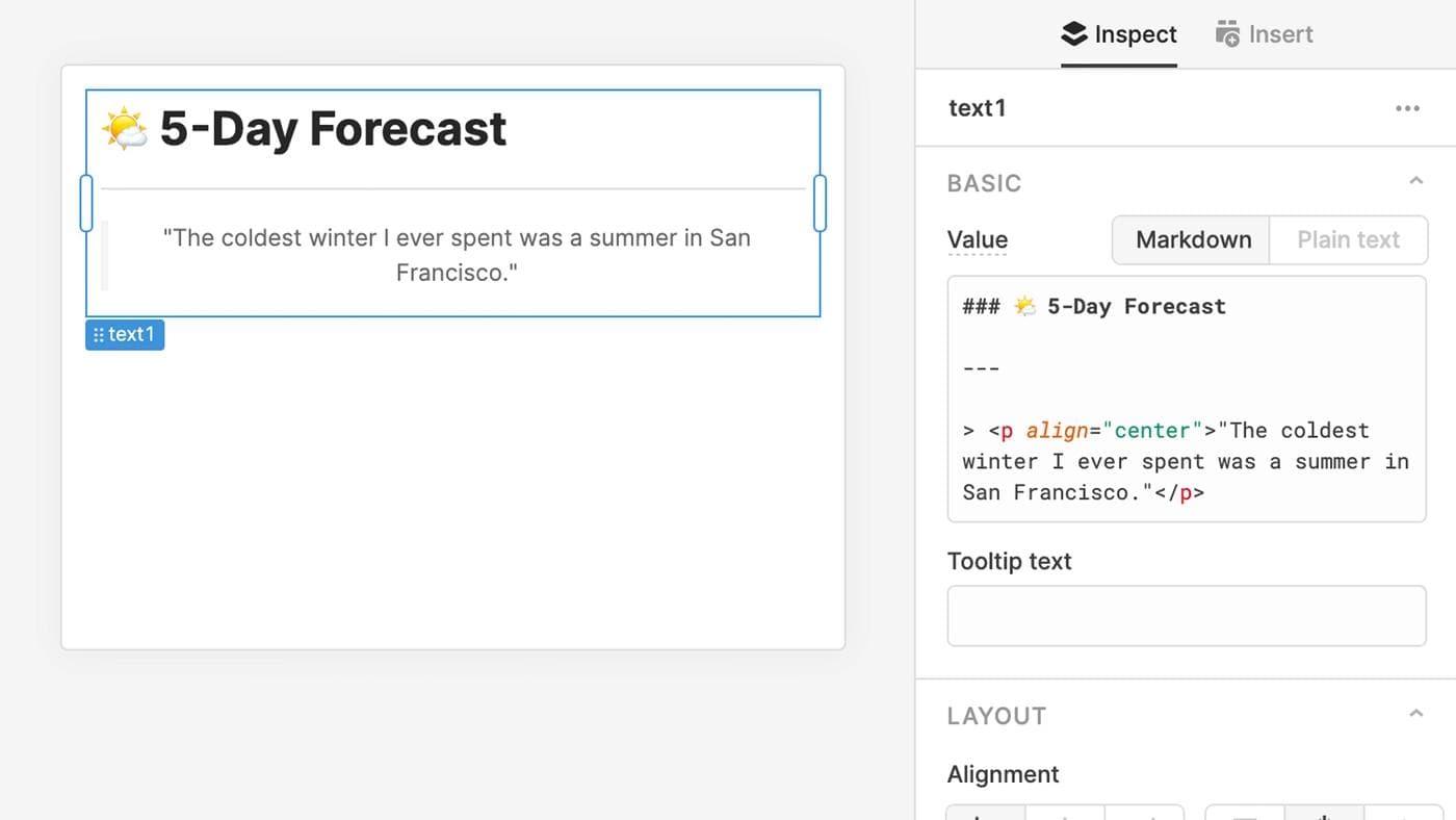 As a quick example, we’ll build a Text component that displays a 5-day forecast for San Francisco. Start by dragging out a new Container onto the canvas, add a Text component, and then type in a simple header: