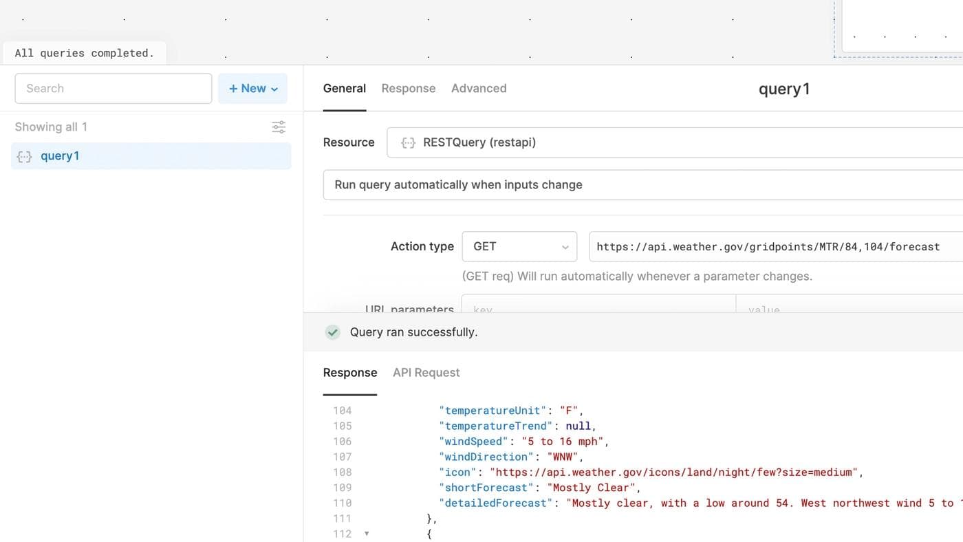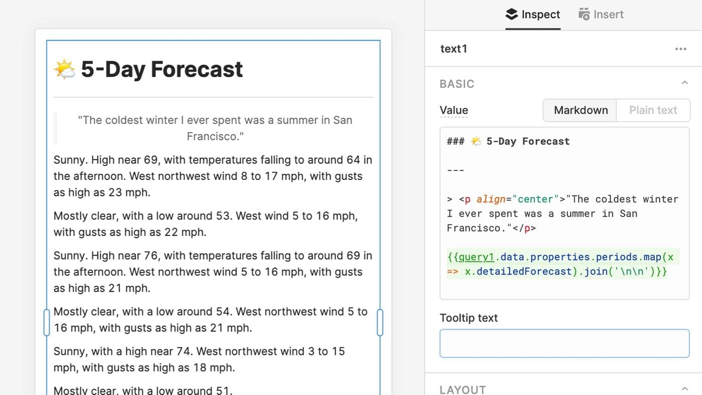 Now we can reference this query right inside the Text component’s value property to get the raw text. Set the parent Container component to "Hug contents" so it'll grow with the new content, then we'll use the map method to list out the detailed forcast for each day: {{query1.data.properties.periods.map(x => x.detailForecast}}