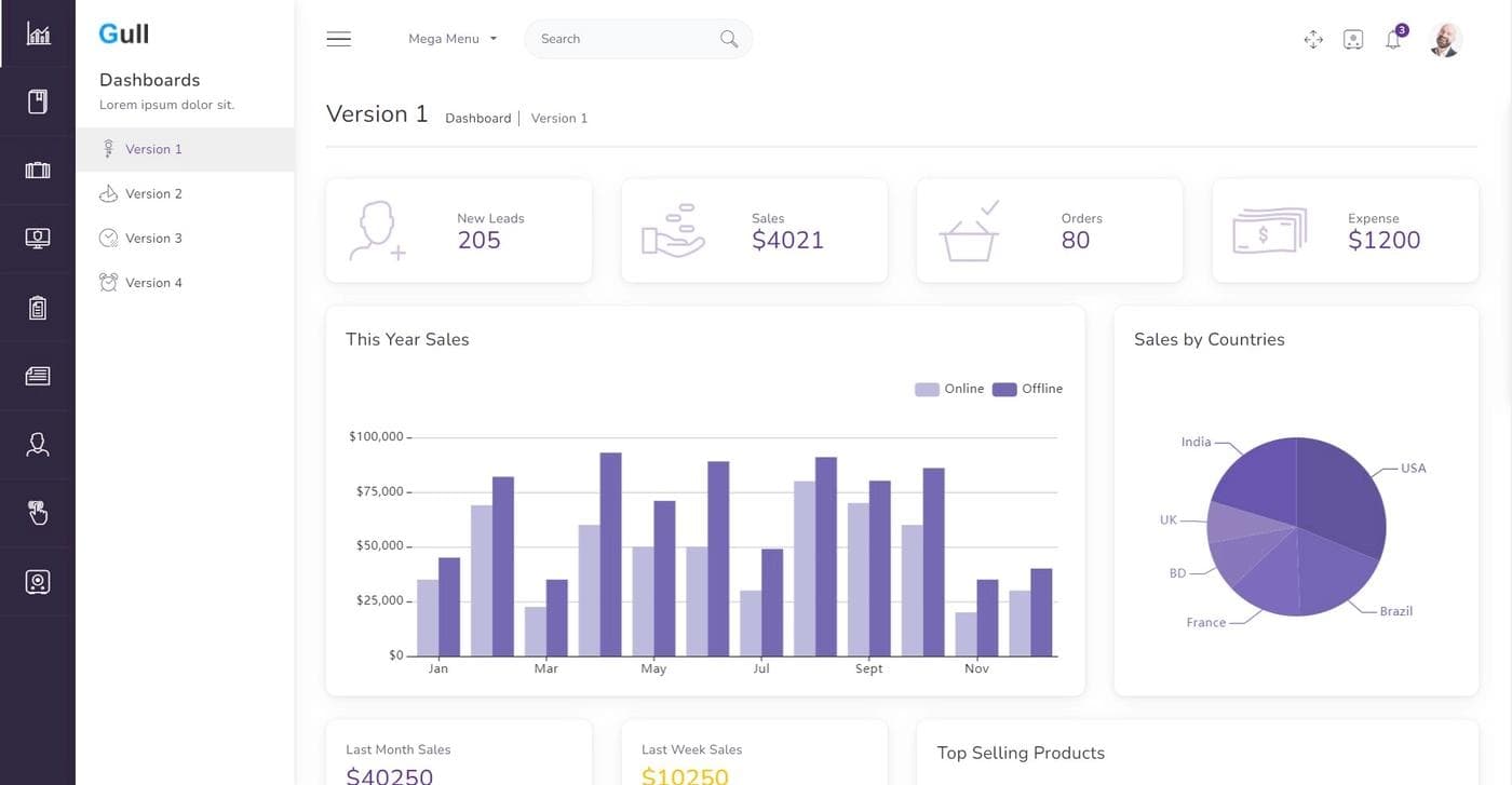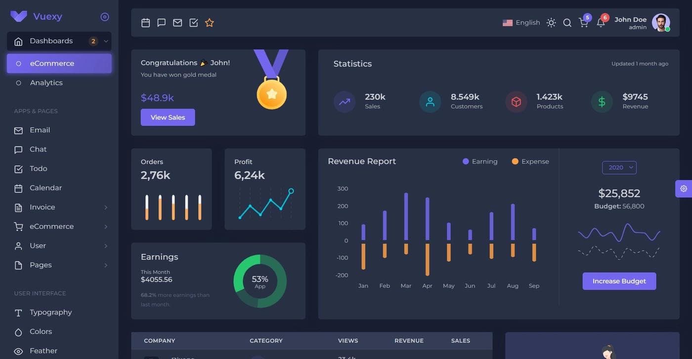 Gull is based on Bootstrap Vue, and at $24 USD, it's less expensive than Vuexy. Even though the price is reasonable, it doesn't compromise quality. It has four dashboard layouts, allowing you to choose which suits you the best, and also offers a dark mode and right-to-left support. The Gull dashboard template also comes with several ready-made pages, and has built-in applications like an invoice builder, chat, and calendar. It also offers a wide array of built-in components. Gull's UI kits are robust enough that you should be able to develop any dashboard you want.