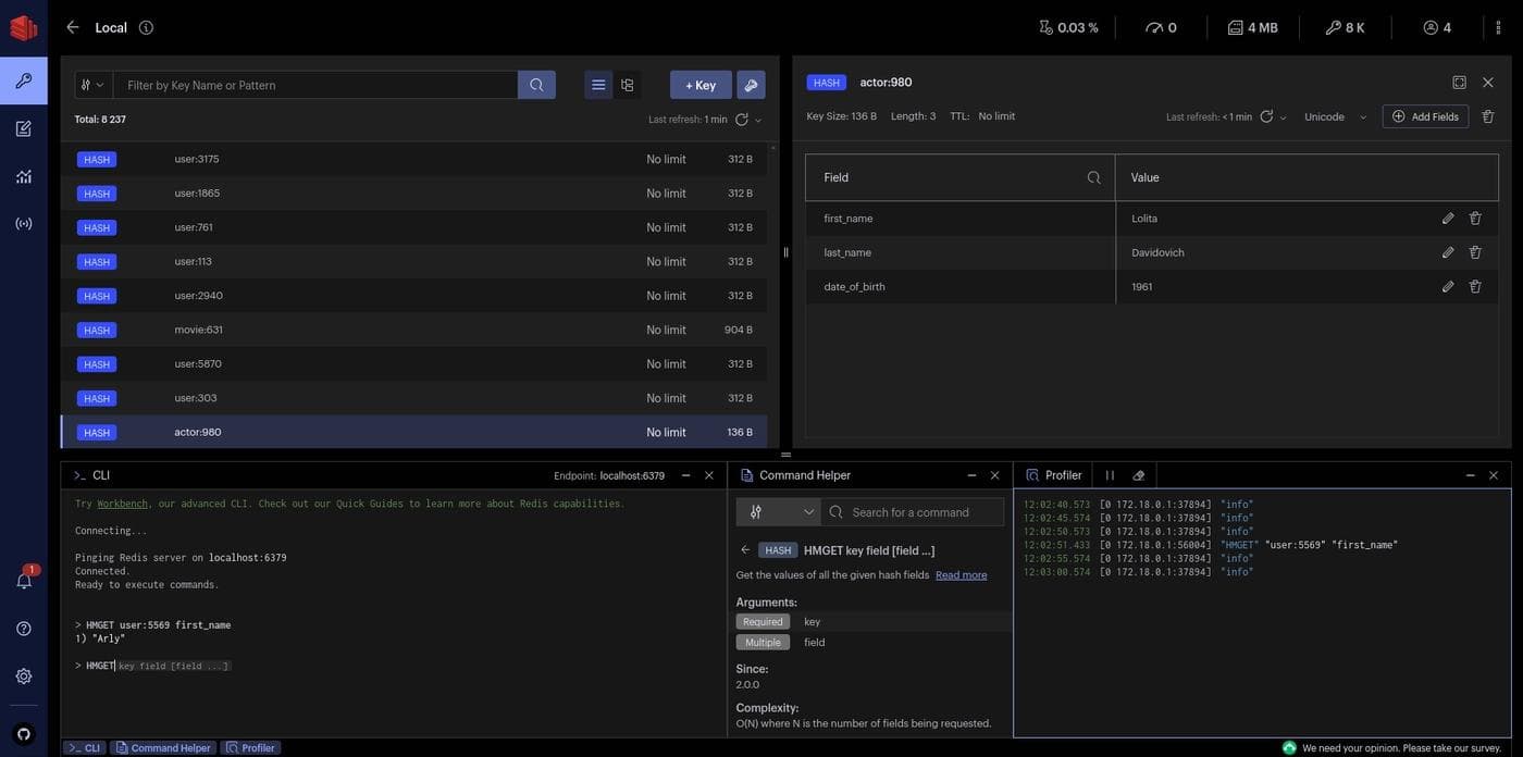 You can also use the Redis CLI from within RedisInsight. You get comprehensive interactive documentation, syntax highlighting, and autocompletion, which is a bit nicer than your terminal.