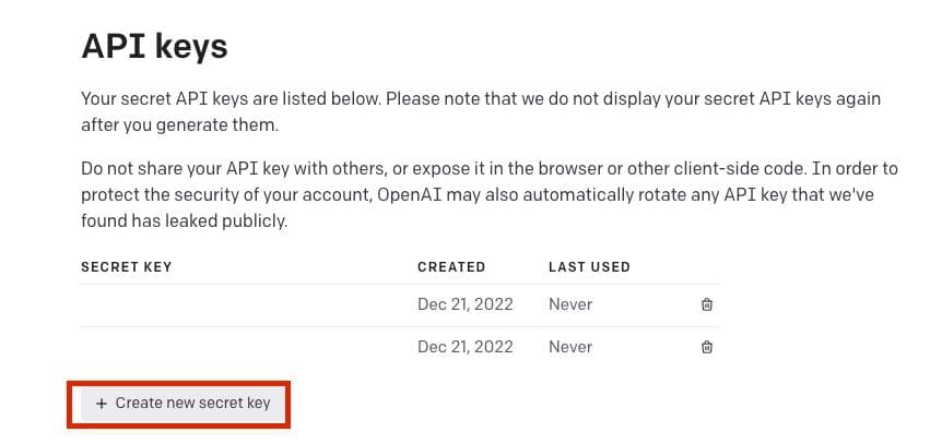 Log in or sign up for an OpenAI account and navigate to your API keys page. Click "Create New Secret Key" in order to create your OpenAI API key. Make sure you keep this key secure and copy it immediately! It can't be accessed again once the window is closed and a new key will be required.