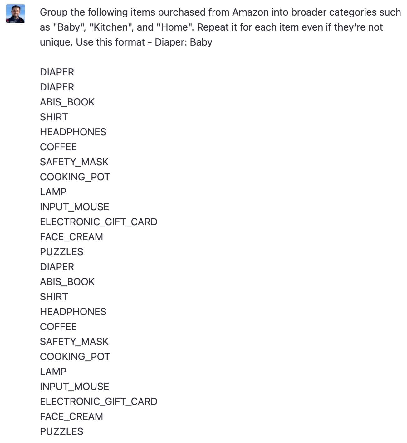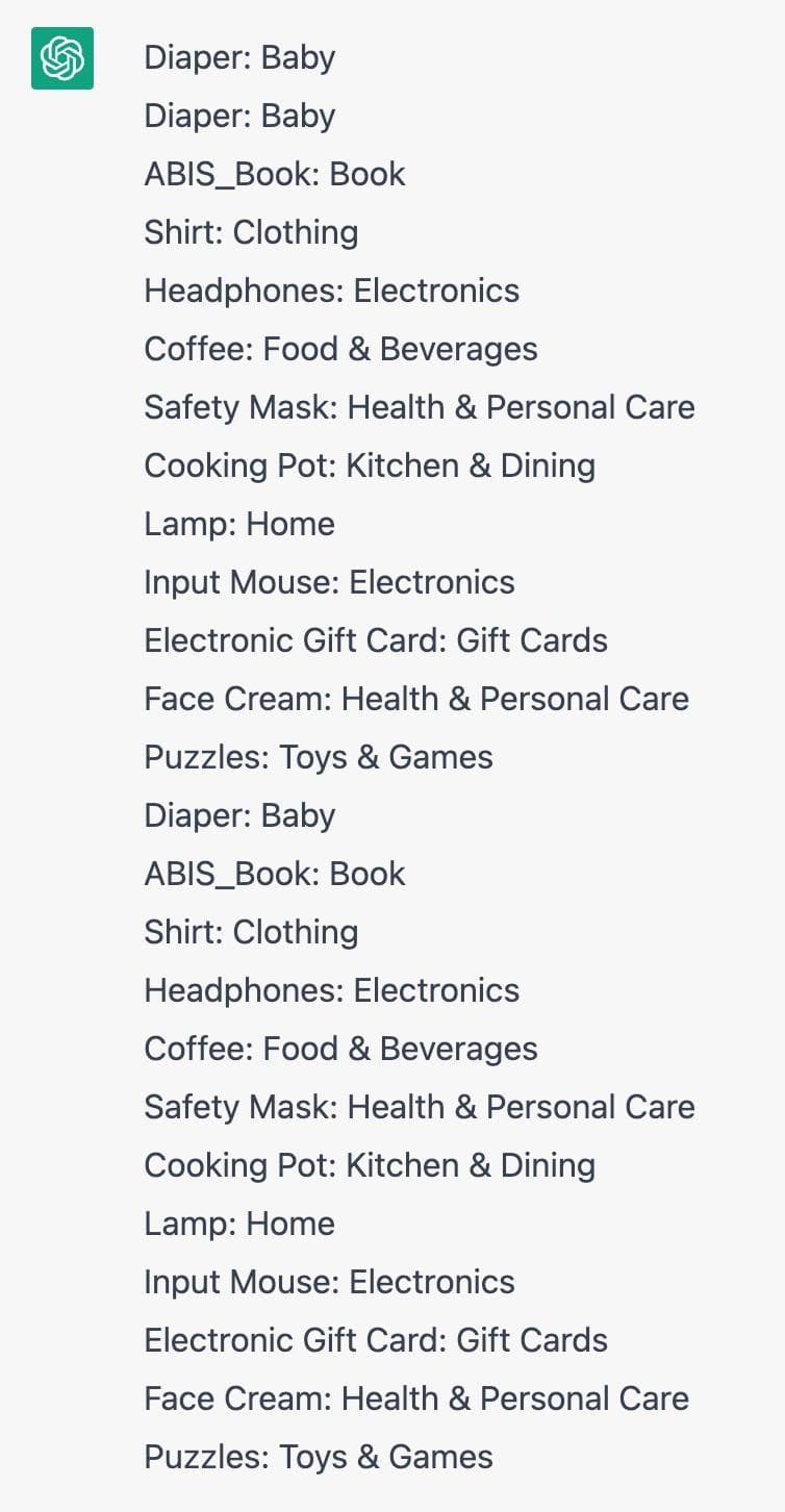 💡Some items, like Gift Cards, may not have a category assigned in the data provided by Amazon. To avoid corrupting the order of the data returned by ChatGPT, you may want to filter these out before passing them to ChatGPT.