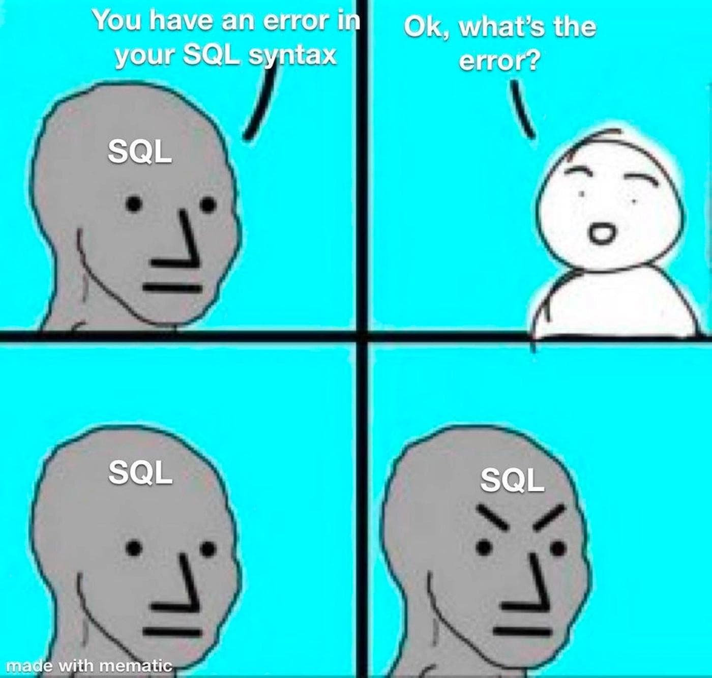 SQL is notorious for returning unhelpful errors. This is partially because SQL statements, unlike most statements in languages like JavaScript, are very long. SQL statements involve filtering data, sorting data, joining data, etc.
