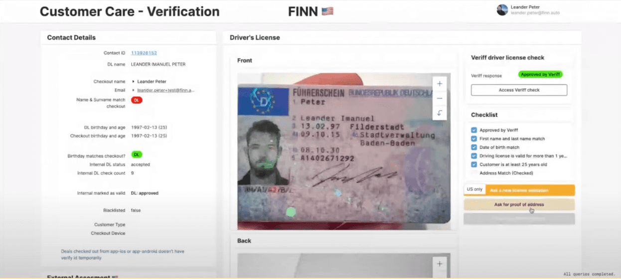 With some vehicles in FINN’s fleet valued up to $160K, it was important to verify drivers before granting access to its services. The internal process of identity verification, however, was fairly manual. To verify a driver’s license, customer care agents needed to: