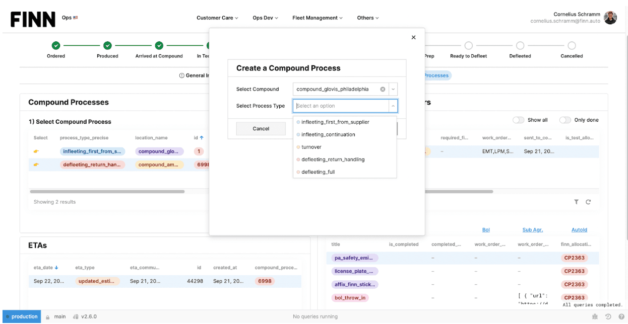 Armed with some knowledge of JavaScript and SQL, Cornelius built most of the Car Details app by himself with minimal coding. And he built it extremely quickly. For example, the “Compound Processes” tab that surfaced ETAs and other workflows took just two days to build. Building the entire app on Retool saved hundreds of engineering hours, and this was just a slice of the 100 internal apps that would be built on top of Retool to operate efficiently. “With Retool, we’re about 10x faster shipping individual applications. It’s just so fast to implement,” says Cornelius.