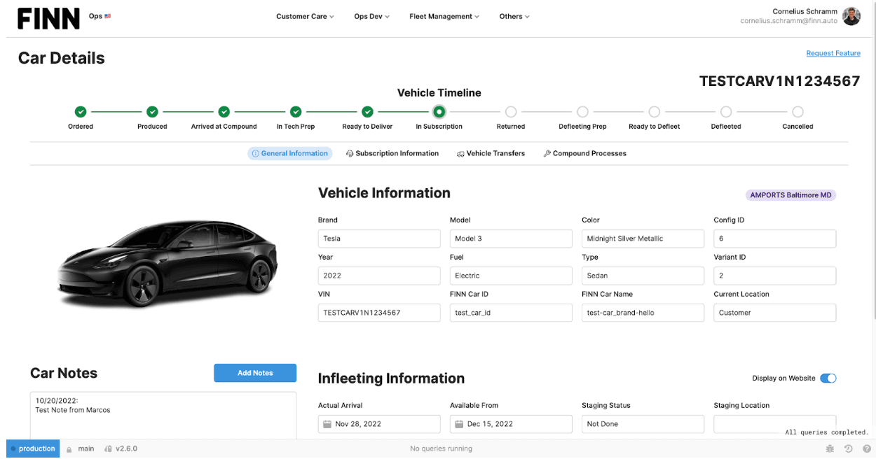 The Car Details App displays the detailed operational state of any car and where it is in the delivery timeline. FPMs can view and edit subscription details, manage vehicle transfers, and interact with partners from one place. Data validation is built-in so that there’s a near-zero chance for human error, giving leaders at FINN more reassurance of the stability and growth of their operations.