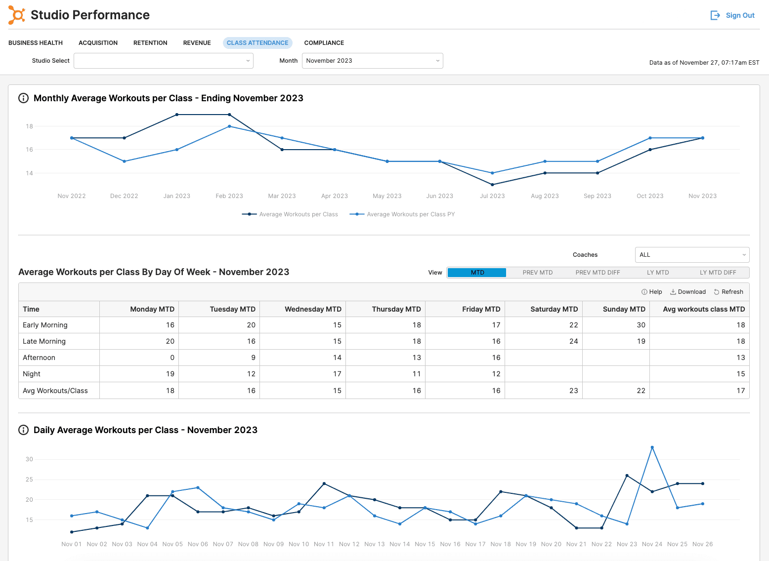Example: Via a member management app, studio managers have visibility into class attendance and more.