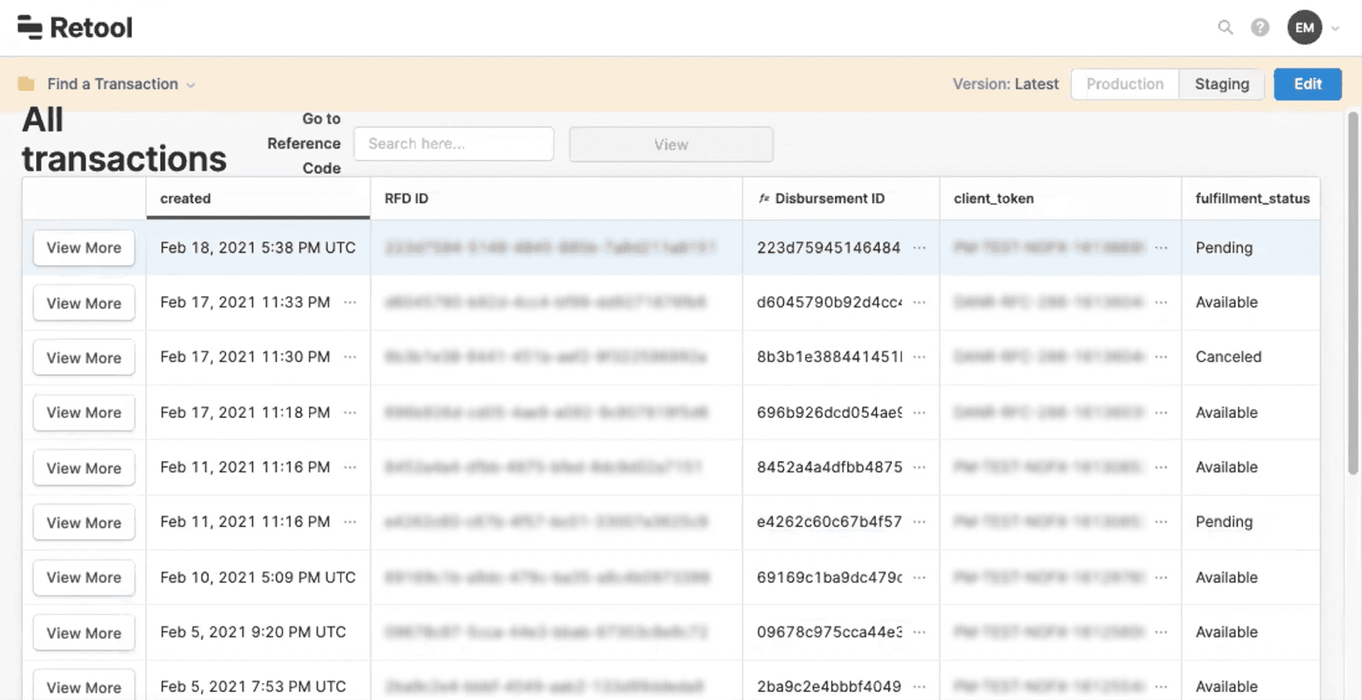 With Retool fully deployed, Ellen got to work building a dashboard where agents can look up transactions and troubleshoot errors.