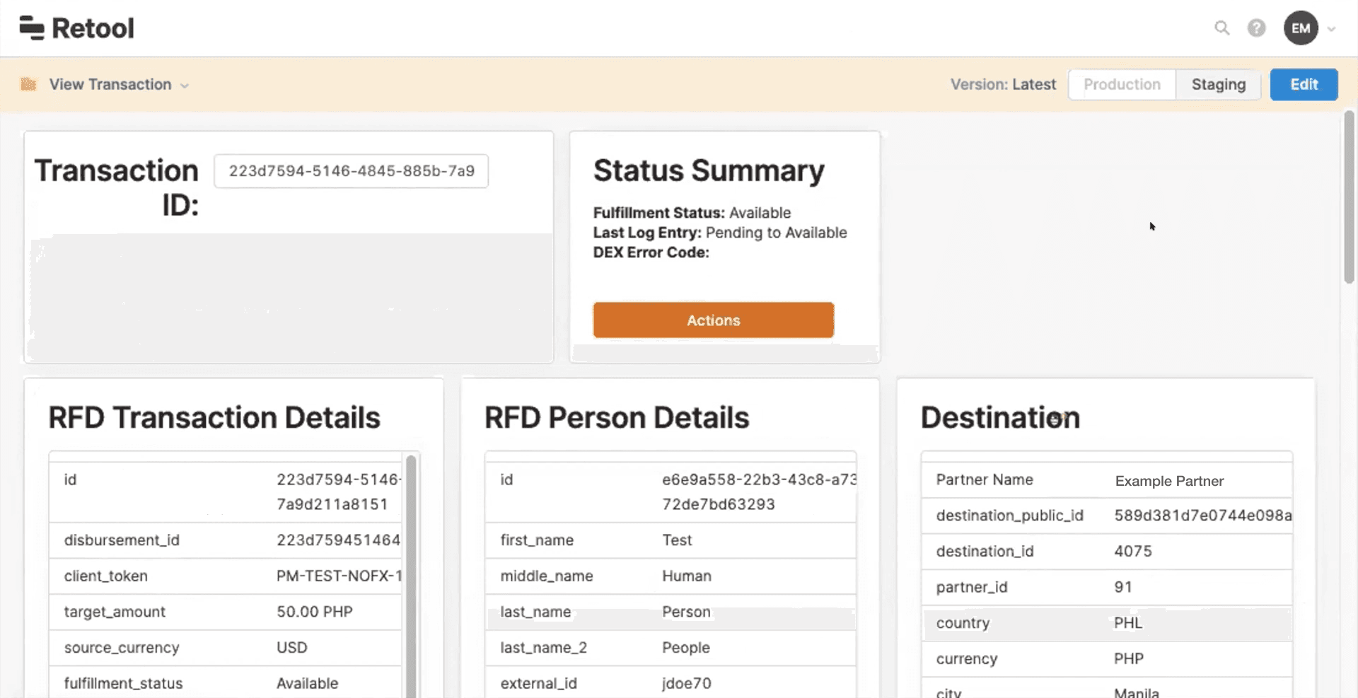 Once Retool was deployed and agents had a way to look up transactions, they added a page that allows agents to actually troubleshoot the partner errors.